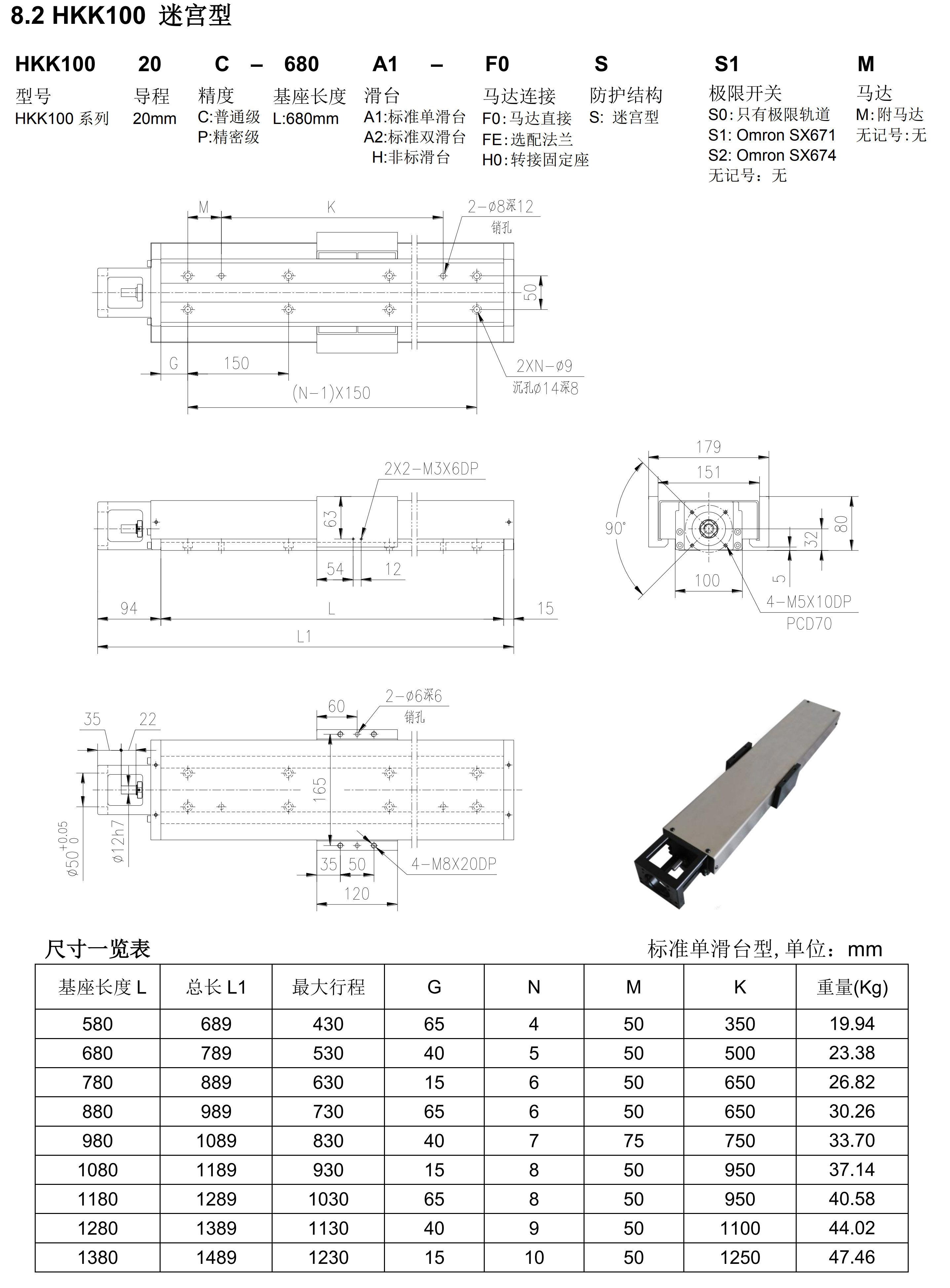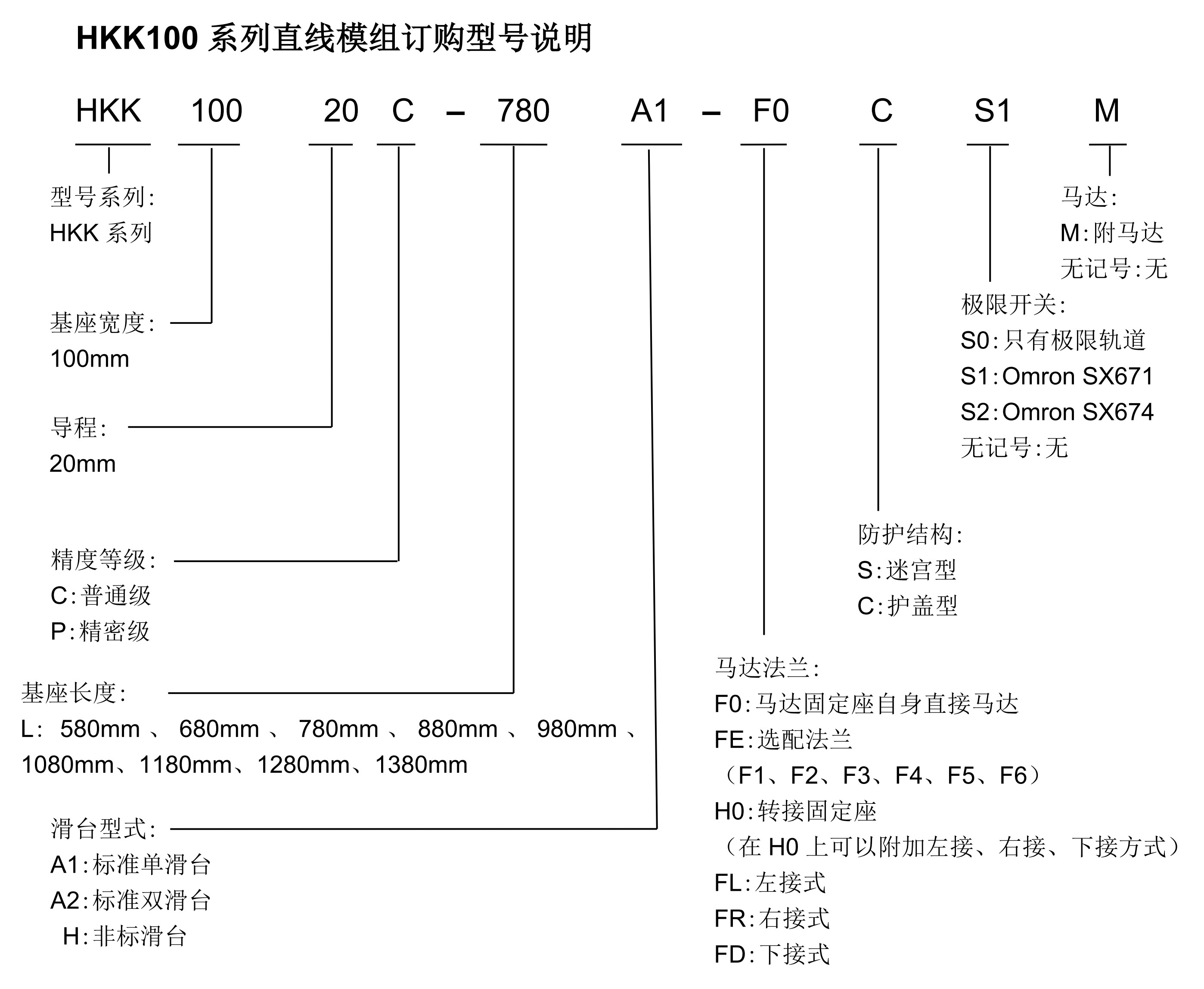 公司專業(yè)生產(chǎn)的線性模組(直線模組,直線滑臺),安裝尺寸國際通用,精選臺灣進口上銀滾動直線導軌和TBI滾珠絲杠搭建,質(zhì)量優(yōu),供貨快。HKK系列線性模組為鋼基座,寬度范圍40mm到130mm,承載能力遠遠超出臺灣上銀KK系列,PMI之KM系列,日本THK之KR/SKR等同尺寸替代線性模租。HKK100系列標準長度有580、680、780、880、980、1080、1180、1280、1380。