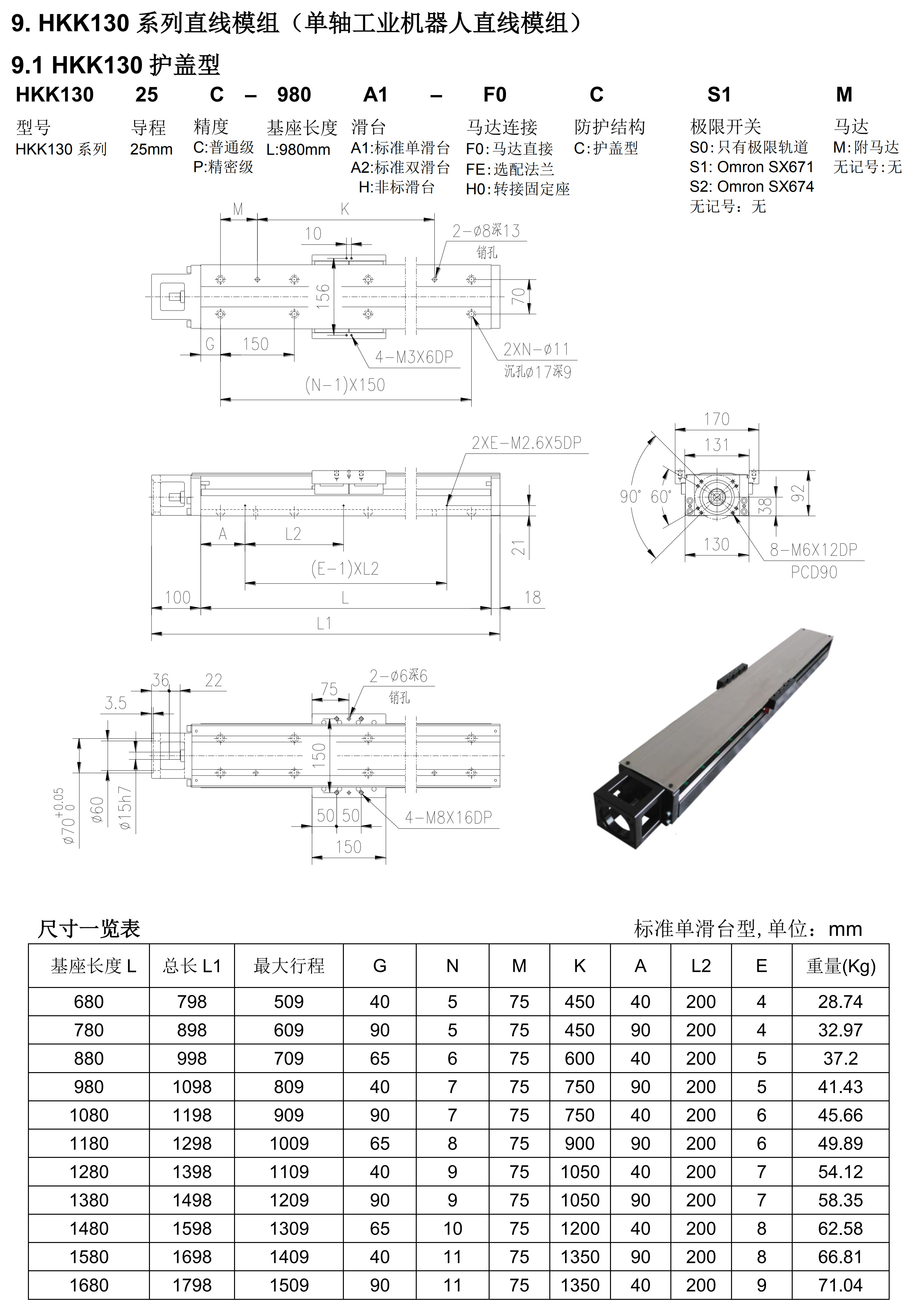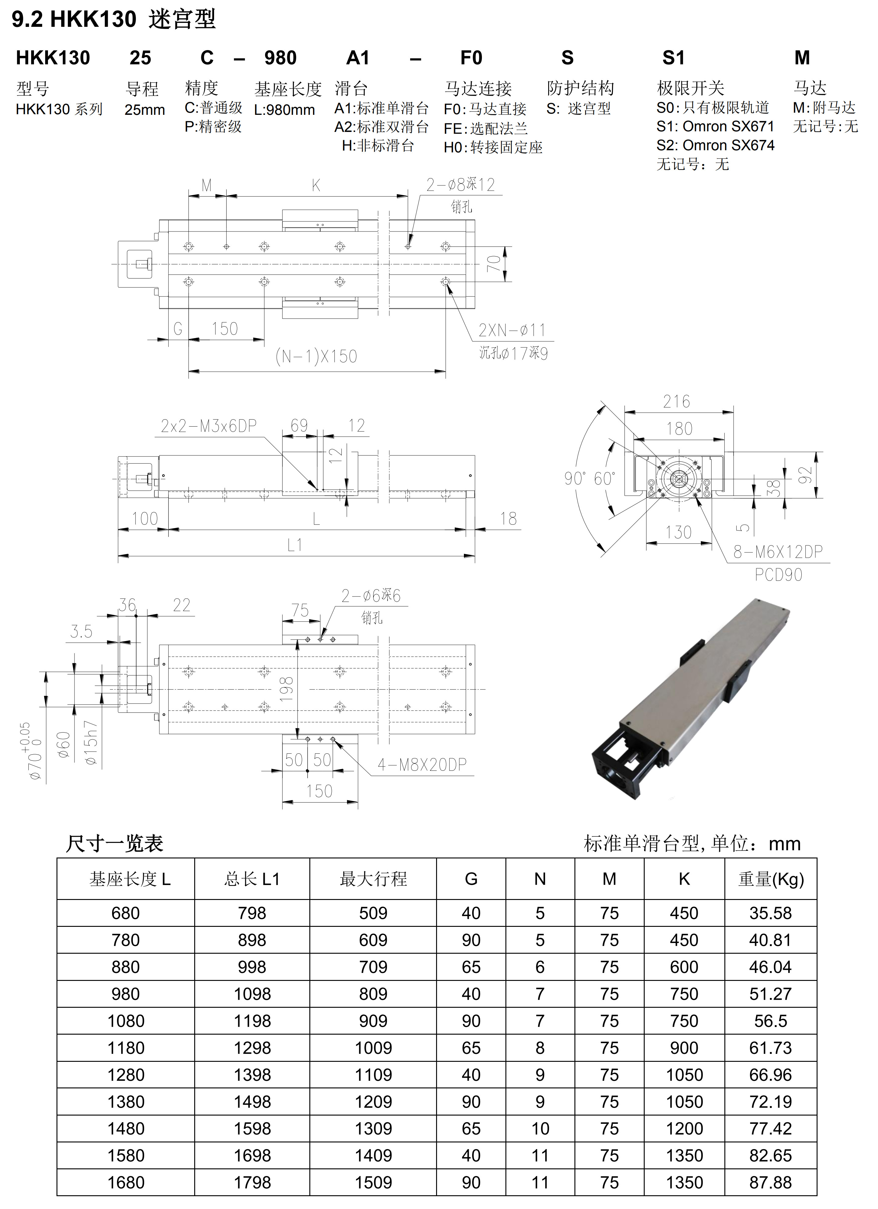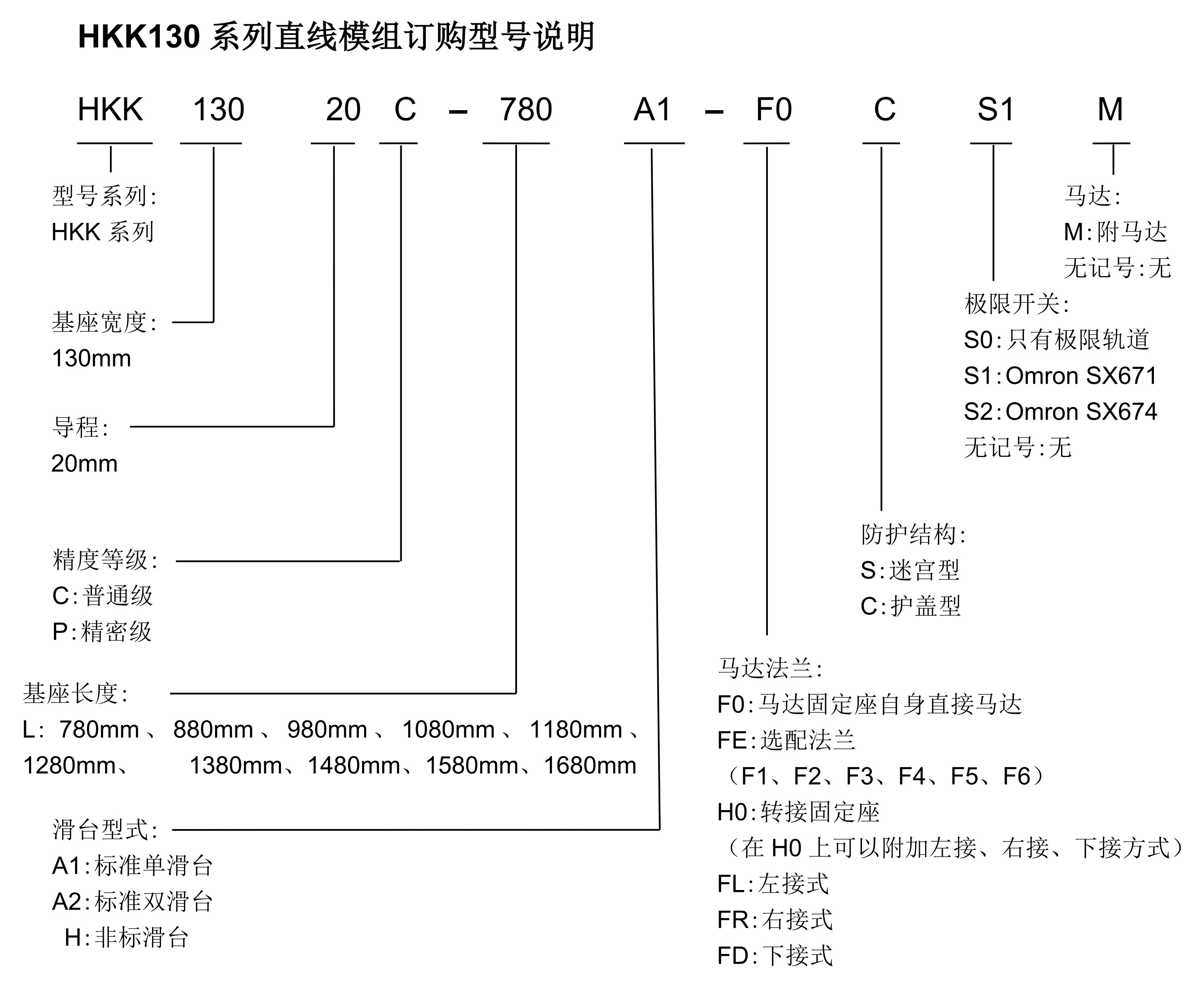 公司專業(yè)生產(chǎn)的線性模組(直線模組,直線滑臺),安裝尺寸國際通用,精選臺灣進(jìn)口上銀滾動直線導(dǎo)軌和TBI滾珠絲杠搭建,質(zhì)量優(yōu),供貨快。HKK系列線性模組為鋼基座,寬度范圍40mm到130mm,承載能力遠(yuǎn)遠(yuǎn)超出臺灣上銀KK系列,PMI之KM系列,日本THK之KR/SKR等同尺寸替代線性模租。HKK130系列標(biāo)準(zhǔn)長度有680、780、880、980、1080、1180、1280、1380、1480、1580、1680。