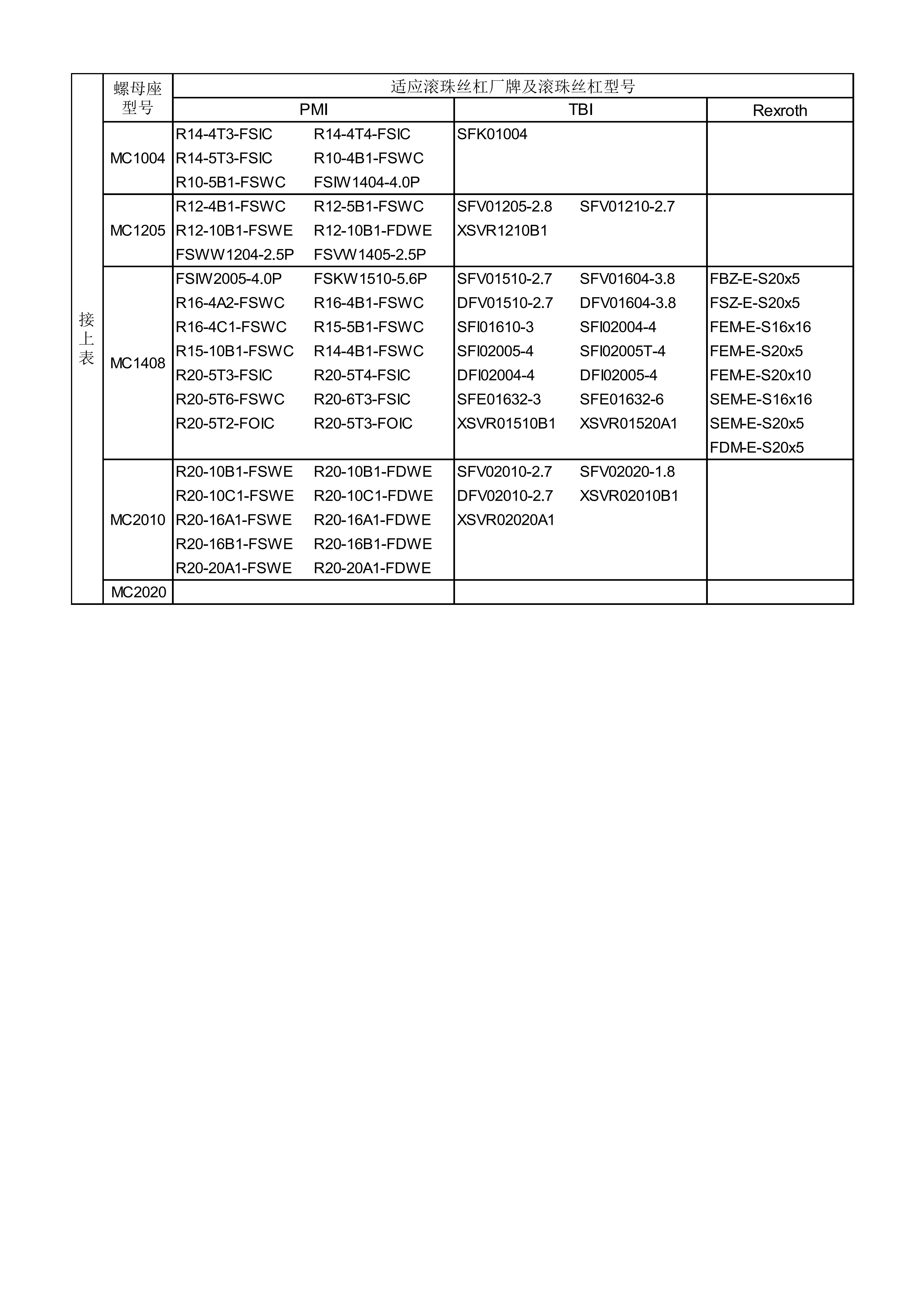 公司研發(fā)和生產(chǎn)全型號世界著名廠商的滾珠絲杠專用螺母承座,特別是MGD/MGS系列,其安裝尺寸完全匹配標(biāo)準(zhǔn)化軋制滾珠絲杠螺母。各產(chǎn)品型號與臺灣嵩陽SYK,日本THK,日本NSK,MISUMI,德國Rexroth相應(yīng)型號通用。NH系列為我公司國際首創(chuàng),在匯總了國際著名滾珠絲杠生產(chǎn)商螺母標(biāo)準(zhǔn)的基礎(chǔ)上,推出了各廠商間通用的螺母座安裝尺寸。MC系列具體型號:MC1004、MC1205、MC1408、MC2010。