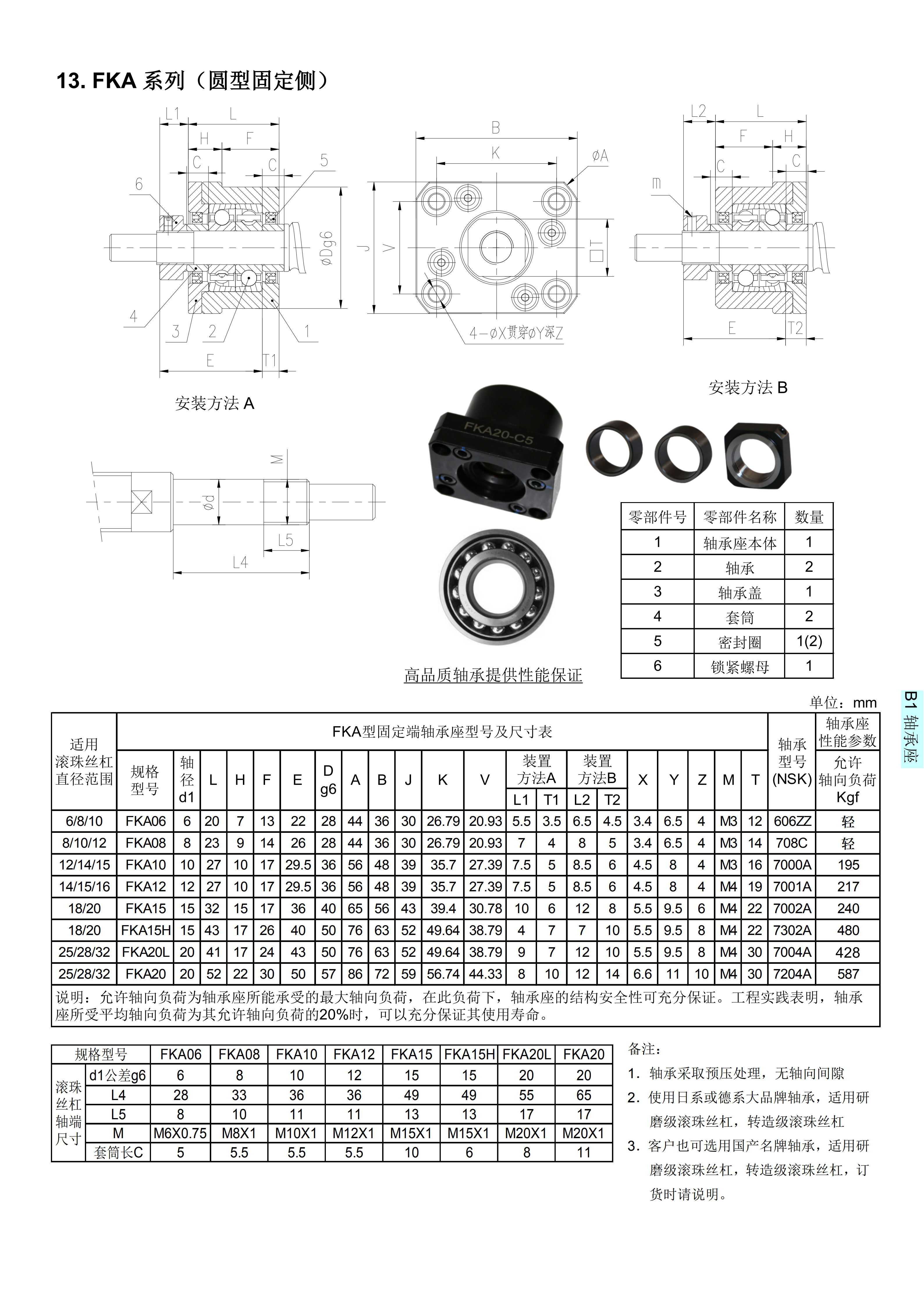 公司專業(yè)研發(fā)和生產(chǎn)世界著名廠商全型號滾珠絲杠專用精密軸承座,并在國際通用型號基礎(chǔ)上,首創(chuàng)了TAC系列重載精密滾珠絲杠專用軸承座。各產(chǎn)品型號與臺灣嵩陽SYK,日本THK,日本NSK,MISUMI,德國Rexroth相應(yīng)型號通用。FKA系列具體型號:FKA06、FKA08、FKA10、FKA12、FKA15、FKA15H、FKA20L、FKA20。