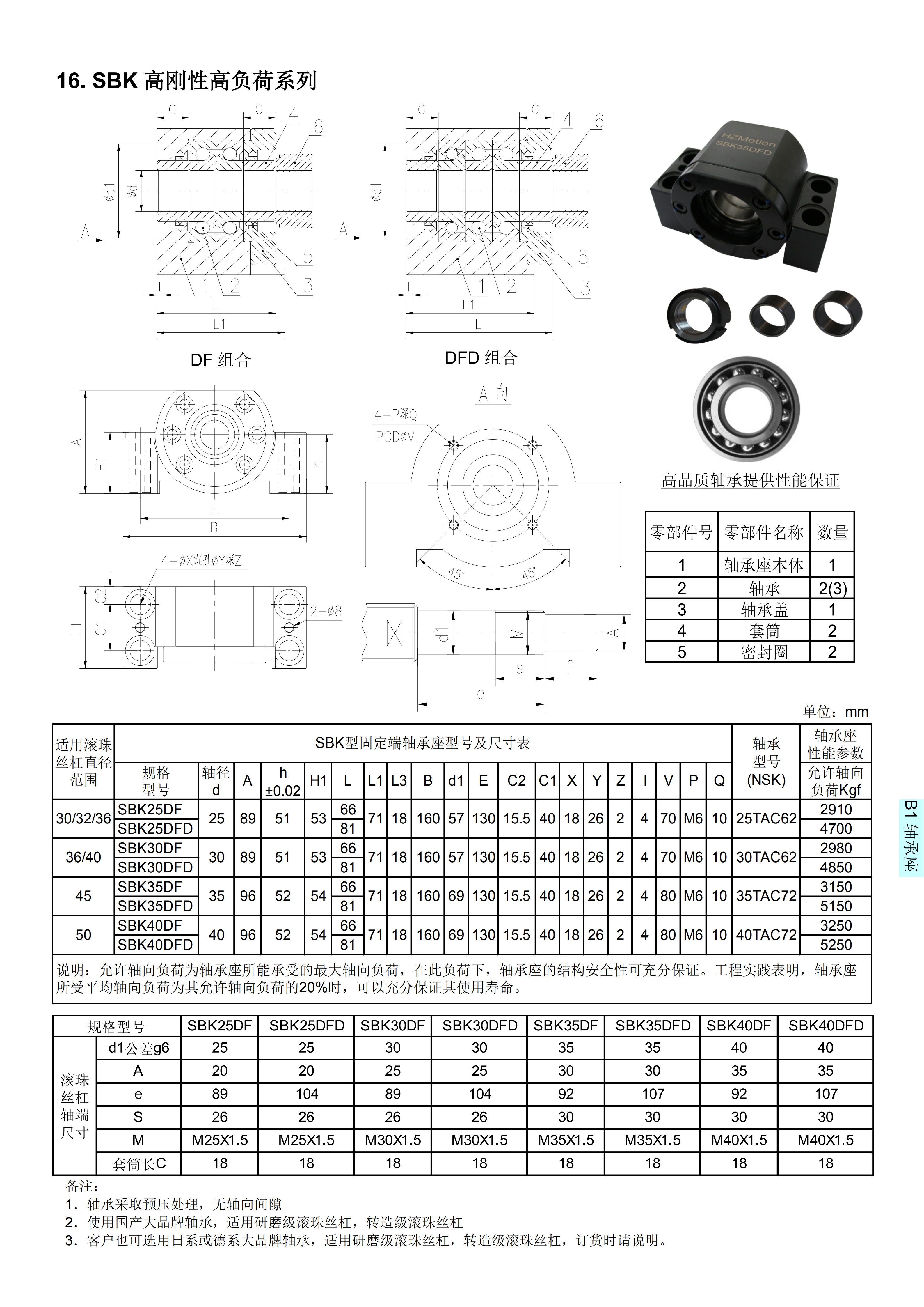 公司專業(yè)研發(fā)和生產(chǎn)世界著名廠商全型號滾珠絲杠專用精密軸承座,并在國際通用型號基礎(chǔ)上,首創(chuàng)了TAC系列重載精密滾珠絲杠專用軸承座。各產(chǎn)品型號與臺灣嵩陽SYK,日本THK,日本NSK,MISUMI,德國Rexroth相應(yīng)型號通用。SBK系列具體型號:SBK25DF、SBK25DFD、SBK30DF、SBK30DFD、SBK35DF、SBK35DFD、SBK40DF、SBK40DFD。