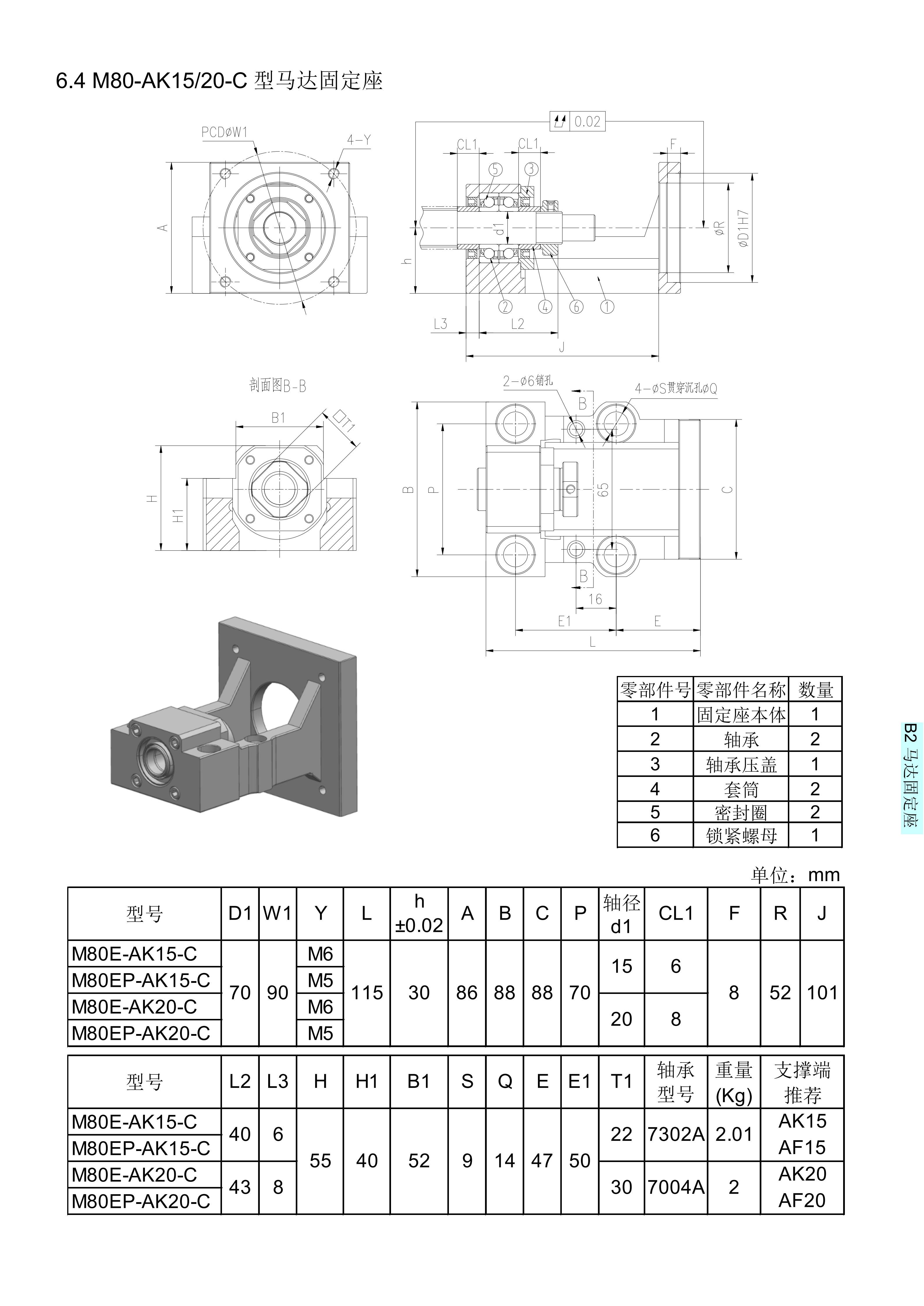 公司研發(fā)和生產(chǎn)的馬達(dá)固定座,馬達(dá)端可適應(yīng)松下,三菱,臺達(dá),東方等著名廠商的伺服馬達(dá)/步進(jìn)馬達(dá),軸承座一端適用國際標(biāo)準(zhǔn)化軸承座,從而,馬達(dá)安裝與滾珠絲杠可保證同心,提高安裝效率與安裝質(zhì)量。A型,B型,C型,H型,L型與臺灣嵩陽SYK相應(yīng)型號通用;KK型等同臺灣上銀KK系列,PMI之KM系列,日本THK之KR/SKR等線性模的固定端。M60-AK15/20-C型馬達(dá)座具體型號:M80E-AK15-C、M80EP-AK15-C、M80E-AK20-C、M80EP-AK20-C、M80E-AK15-C、M80EP-AK15-C、M80E-AK20-C、M80EP-AK20-C。
