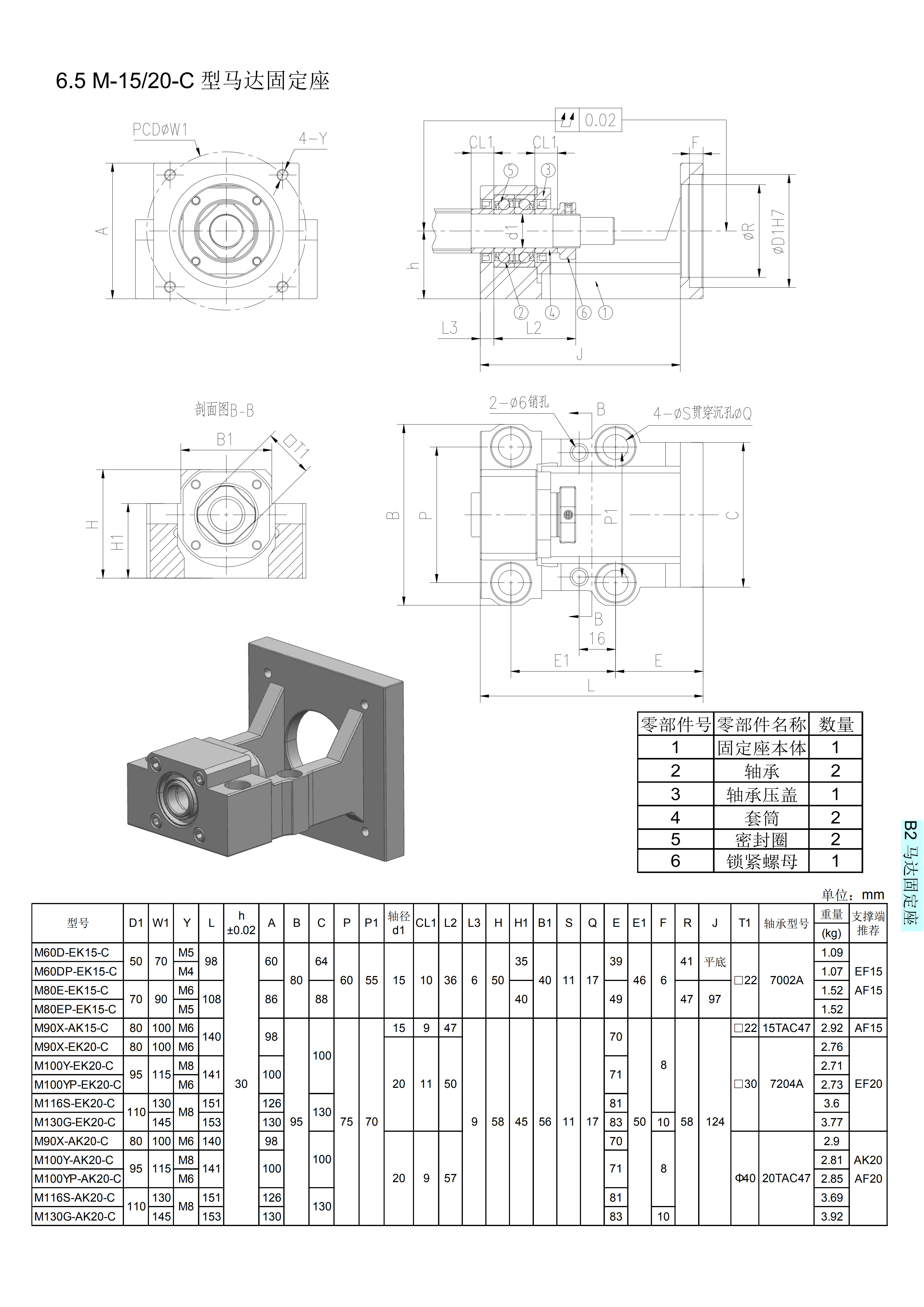 公司研發(fā)和生產(chǎn)的馬達固定座,馬達端可適應(yīng)松下,三菱,臺達,東方等著名廠商的伺服馬達/步進馬達,軸承座一端適用國際標準化軸承座,從而,馬達安裝與滾珠絲杠可保證同心,提高安裝效率與安裝質(zhì)量。A型,B型,C型,H型,L型與臺灣嵩陽SYK相應(yīng)型號通用;KK型等同臺灣上銀KK系列,PMI之KM系列,日本THK之KR/SKR等線性模的固定端。M-15/20-C型馬達座具體型號:M60D-EK15-C、M60DP-EK15-C、M80E-EK15-C、M80EP-EK15-C、M90X-AK15-C、M90X-EK20-C、M100Y-EK20-C、M100YP-EK20-C、M116S-EK20-C、M130G-EK20-C、M90X-AK20-C、M100Y-AK20-C、M100YP-AK20-C、M116S-AK20-C、M130G-AK20-C。
