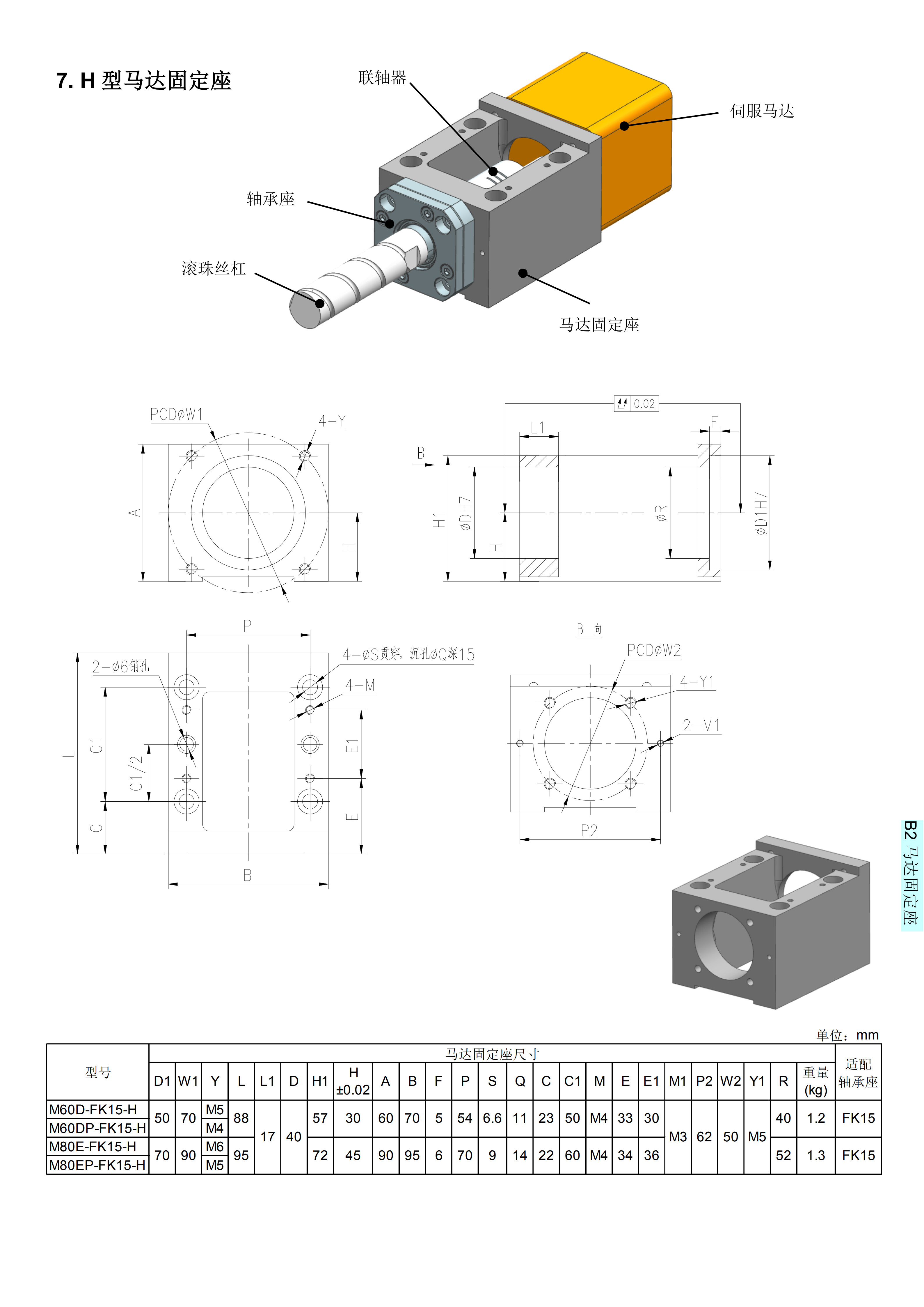 公司研發(fā)和生產(chǎn)的馬達(dá)固定座,馬達(dá)端可適應(yīng)松下,三菱,臺(tái)達(dá),東方等著名廠商的伺服馬達(dá)/步進(jìn)馬達(dá),軸承座一端適用國際標(biāo)準(zhǔn)化軸承座,從而,馬達(dá)安裝與滾珠絲杠可保證同心,提高安裝效率與安裝質(zhì)量。A型,B型,C型,H型,L型與臺(tái)灣嵩陽SYK相應(yīng)型號(hào)通用;KK型等同臺(tái)灣上銀KK系列,PMI之KM系列,日本THK之KR/SKR等線性模的固定端。H型馬達(dá)座具體型號(hào):M60D-FK15-H、M60DP-FK15-H、M80E-FK15-H、M80EP-FK15-H。