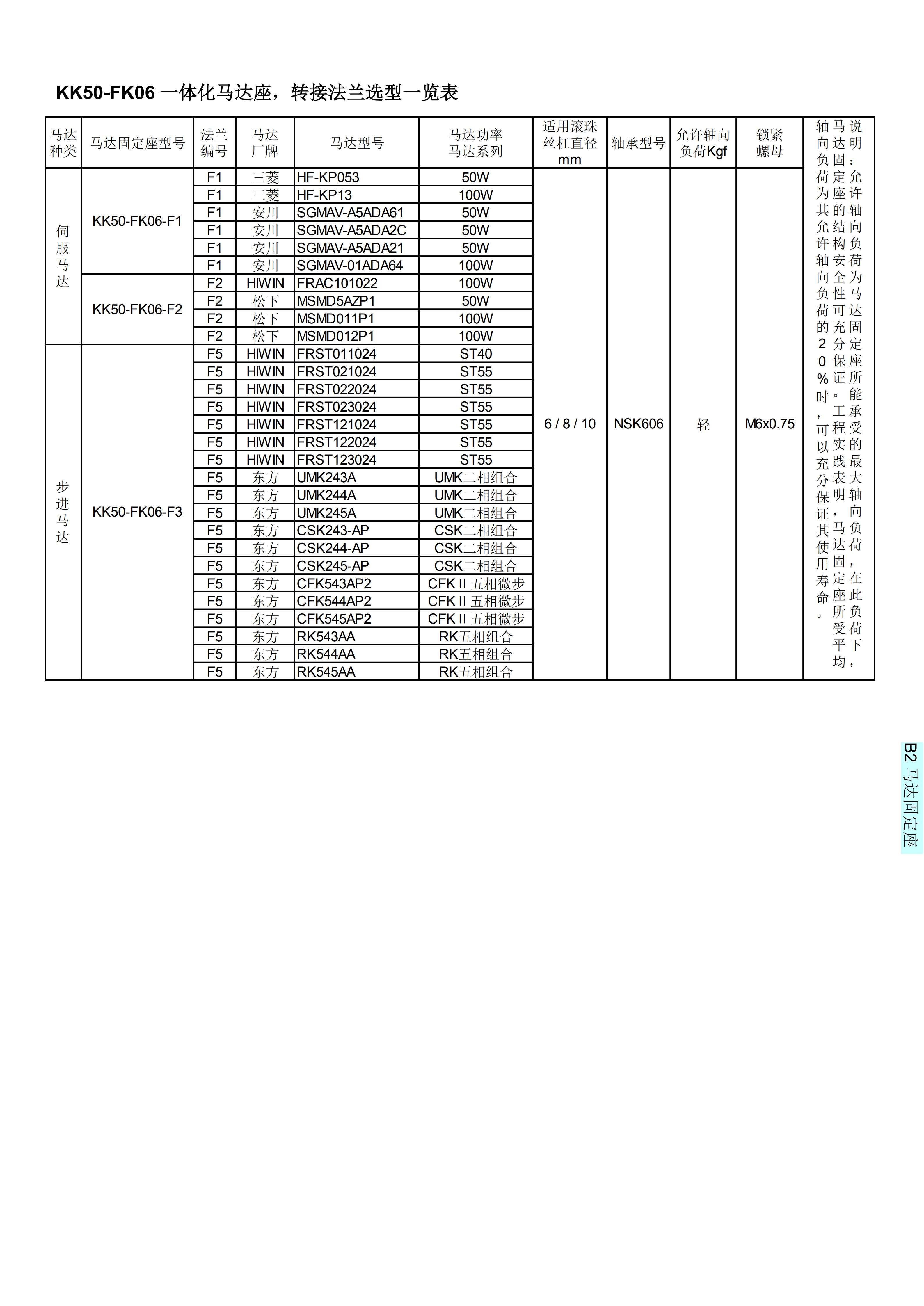 公司研發(fā)和生產(chǎn)的馬達(dá)固定座,馬達(dá)端可適應(yīng)松下,三菱,臺(tái)達(dá),東方等著名廠商的伺服馬達(dá)/步進(jìn)馬達(dá),軸承座一端適用國(guó)際標(biāo)準(zhǔn)化軸承座,從而,馬達(dá)安裝與滾珠絲杠可保證同心,提高安裝效率與安裝質(zhì)量。A型,B型,C型,H型,L型與臺(tái)灣嵩陽(yáng)SYK相應(yīng)型號(hào)通用;KK型等同臺(tái)灣上銀KK系列,PMI之KM系列,日本THK之KR/SKR等線性模的固定端。KK50-FK06一體化馬達(dá)座具體型號(hào):KK50-FK06-F1、KK50-FK06-F2、KK50-FK06-F3。
