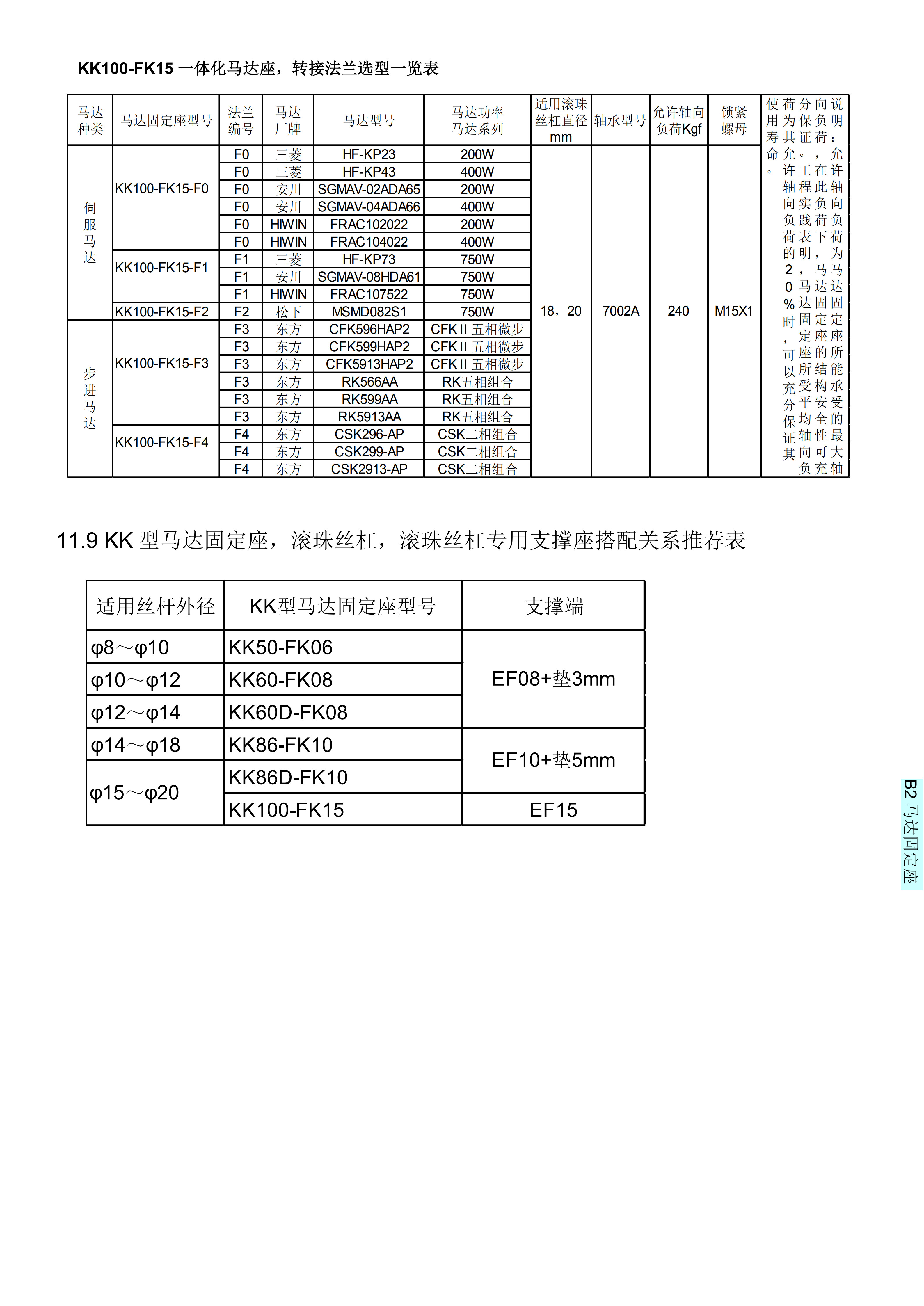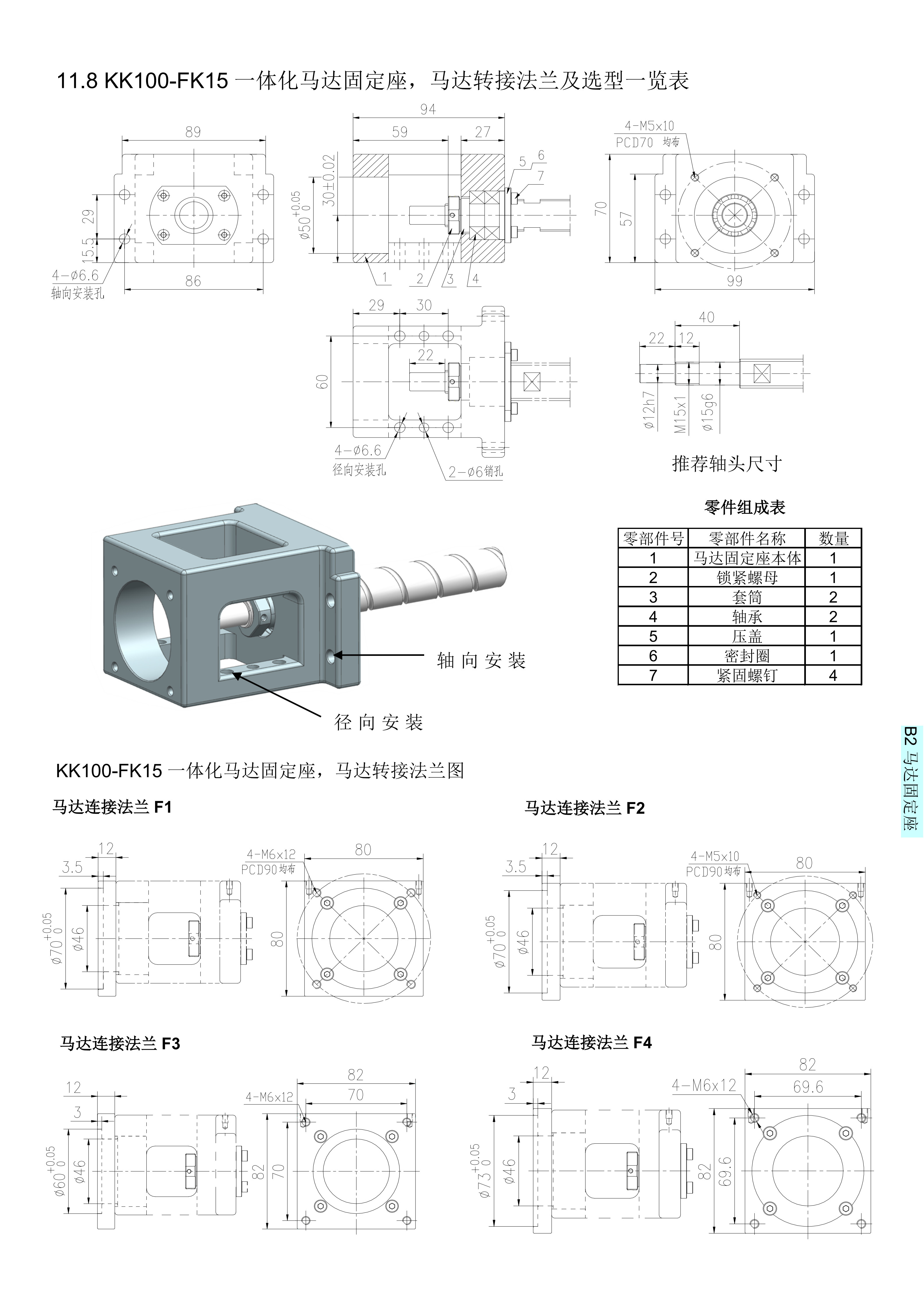 公司研發(fā)和生產(chǎn)的馬達(dá)固定座,馬達(dá)端可適應(yīng)松下,三菱,臺(tái)達(dá),東方等著名廠商的伺服馬達(dá)/步進(jìn)馬達(dá),軸承座一端適用國(guó)際標(biāo)準(zhǔn)化軸承座,從而,馬達(dá)安裝與滾珠絲杠可保證同心,提高安裝效率與安裝質(zhì)量。A型,B型,C型,H型,L型與臺(tái)灣嵩陽(yáng)SYK相應(yīng)型號(hào)通用;KK型等同臺(tái)灣上銀KK系列,PMI之KM系列,日本THK之KR/SKR等線性模的固定端。KK100-FK15一體化馬達(dá)座具體型號(hào):KK100-FK15-F0、KK100-FK15-F1、KK100-FK15-F2、KK100-FK15-F3、KK100-FK15-F4。